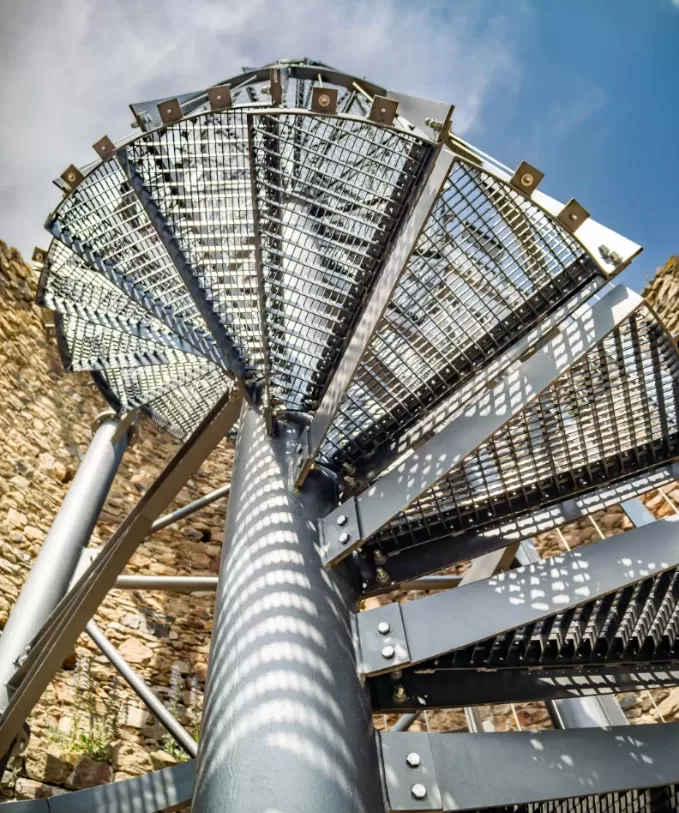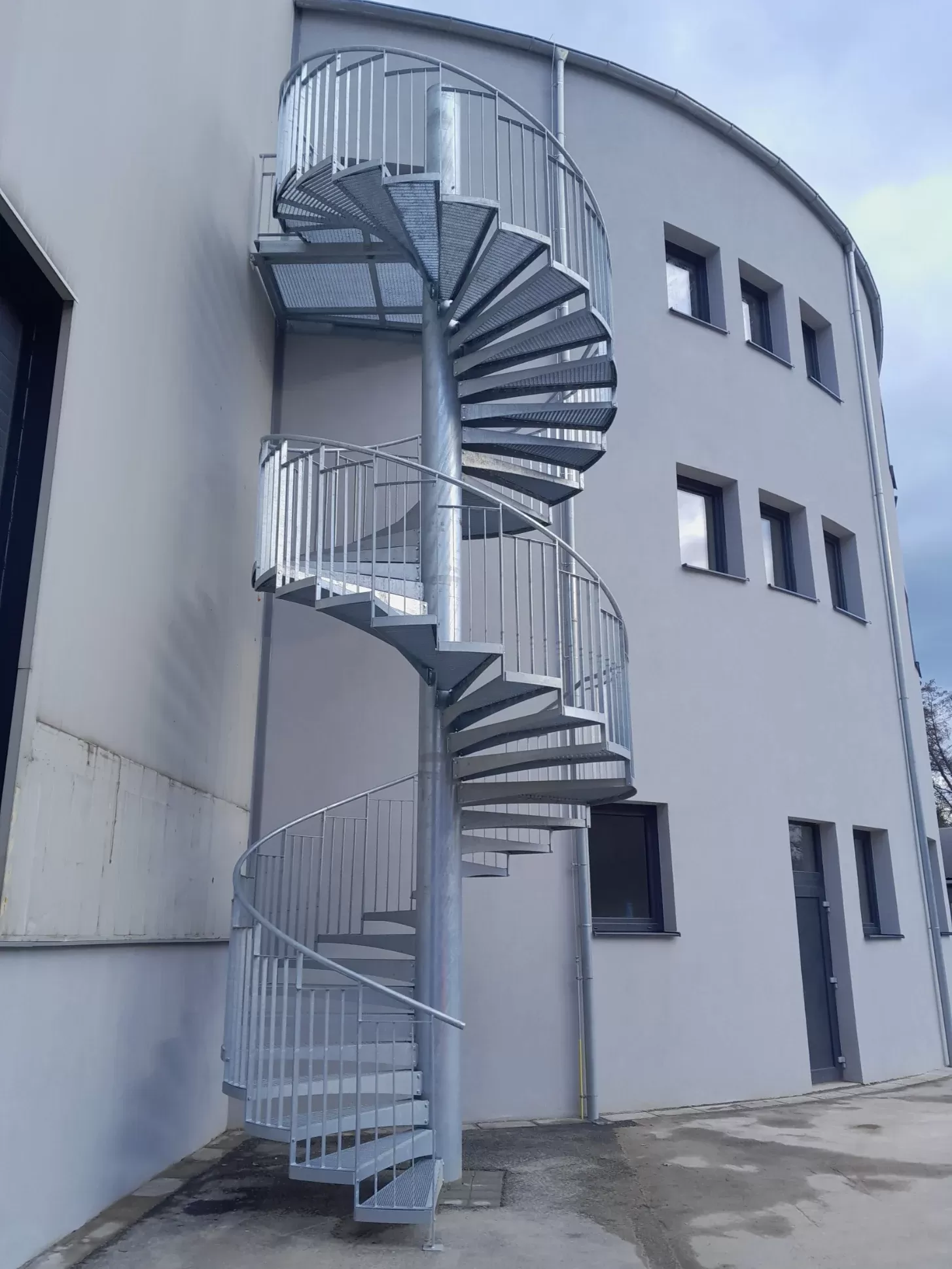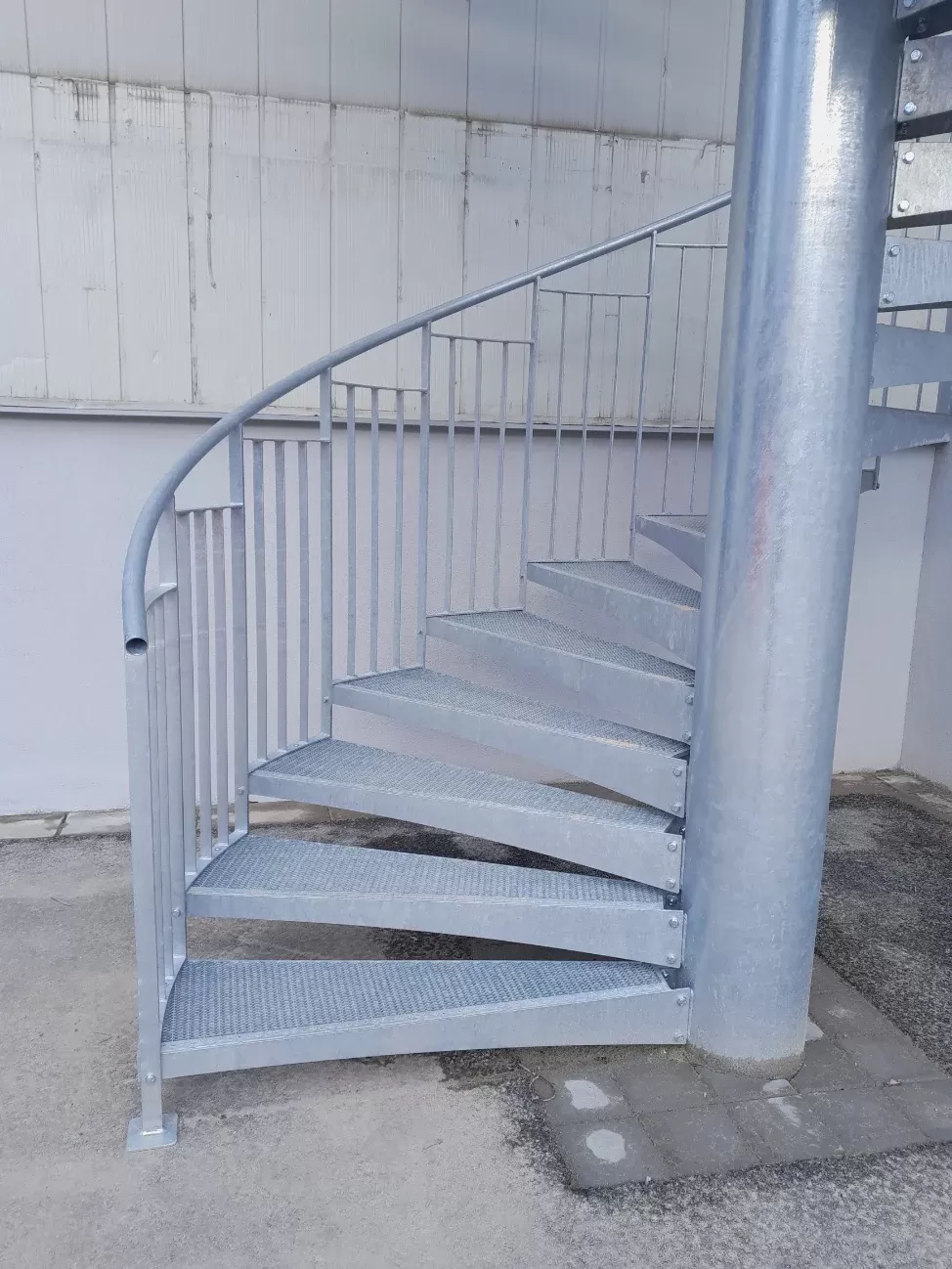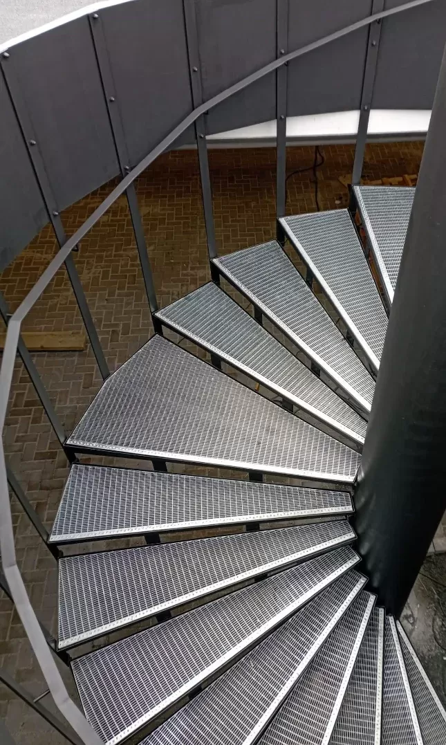 Application: Spiral access staircase and gallery mezzanine | Type: Press-locked stair tread, plain, 33 × 11 mm / load-bearing bar 40 × 2 mm and press-locked grating, plain, 33 × 33 mm / load-bearing bar 30 × 2 mm | Material: Steel | Surface finish: Hot-dip galvanised