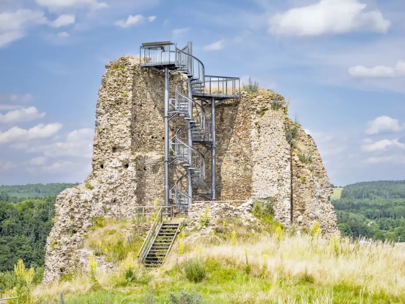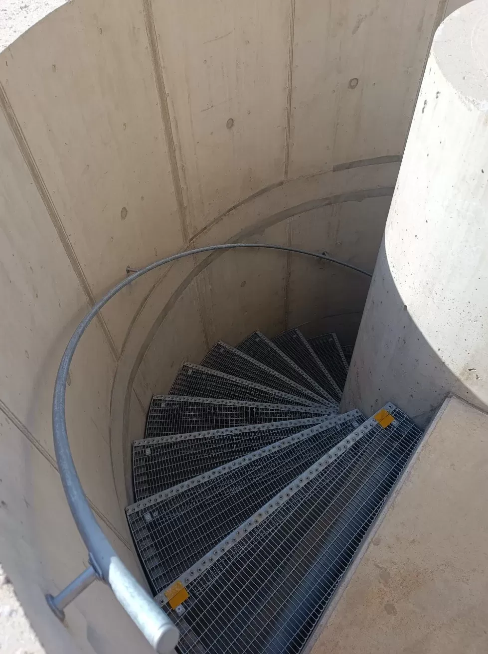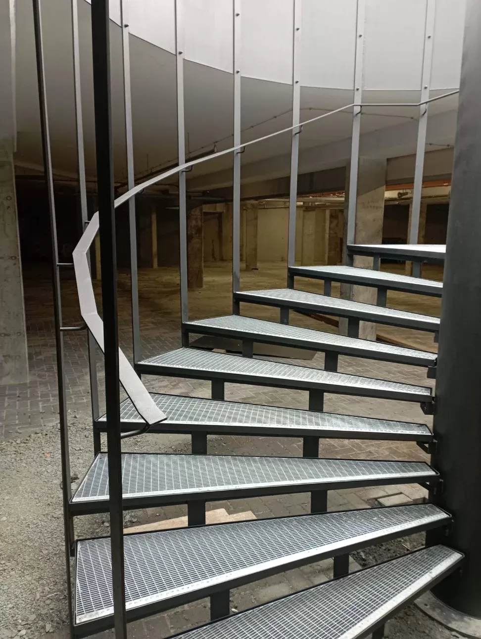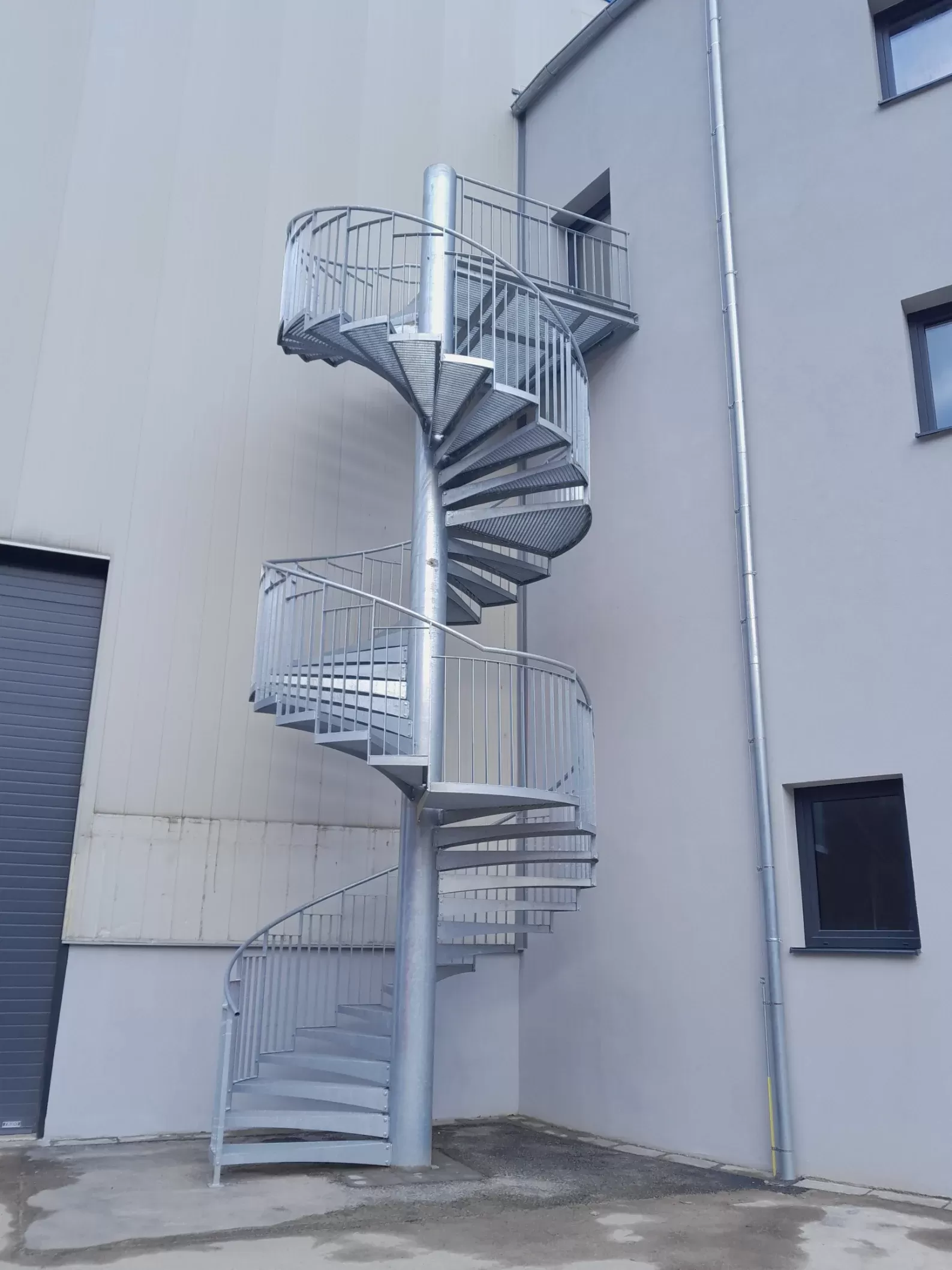 Application: Spiral access staircase and gallery mezzanine | Type: Press-locked stair tread, plain, 33 × 11 mm / load-bearing bar 40 × 2 mm and press-locked grating, plain, 33 × 33 mm / load-bearing bar 30 × 2 mm | Material: Steel | Surface finish: Hot-dip galvanised