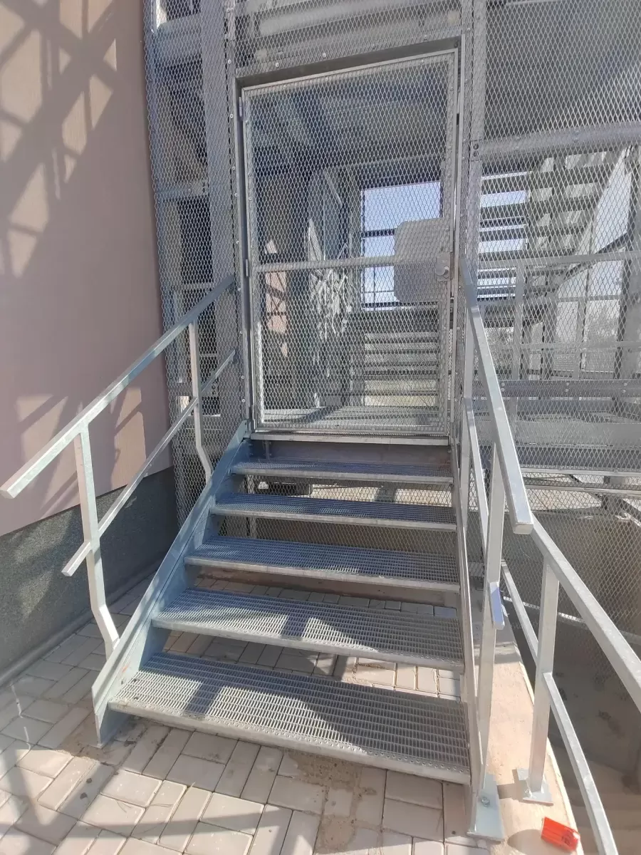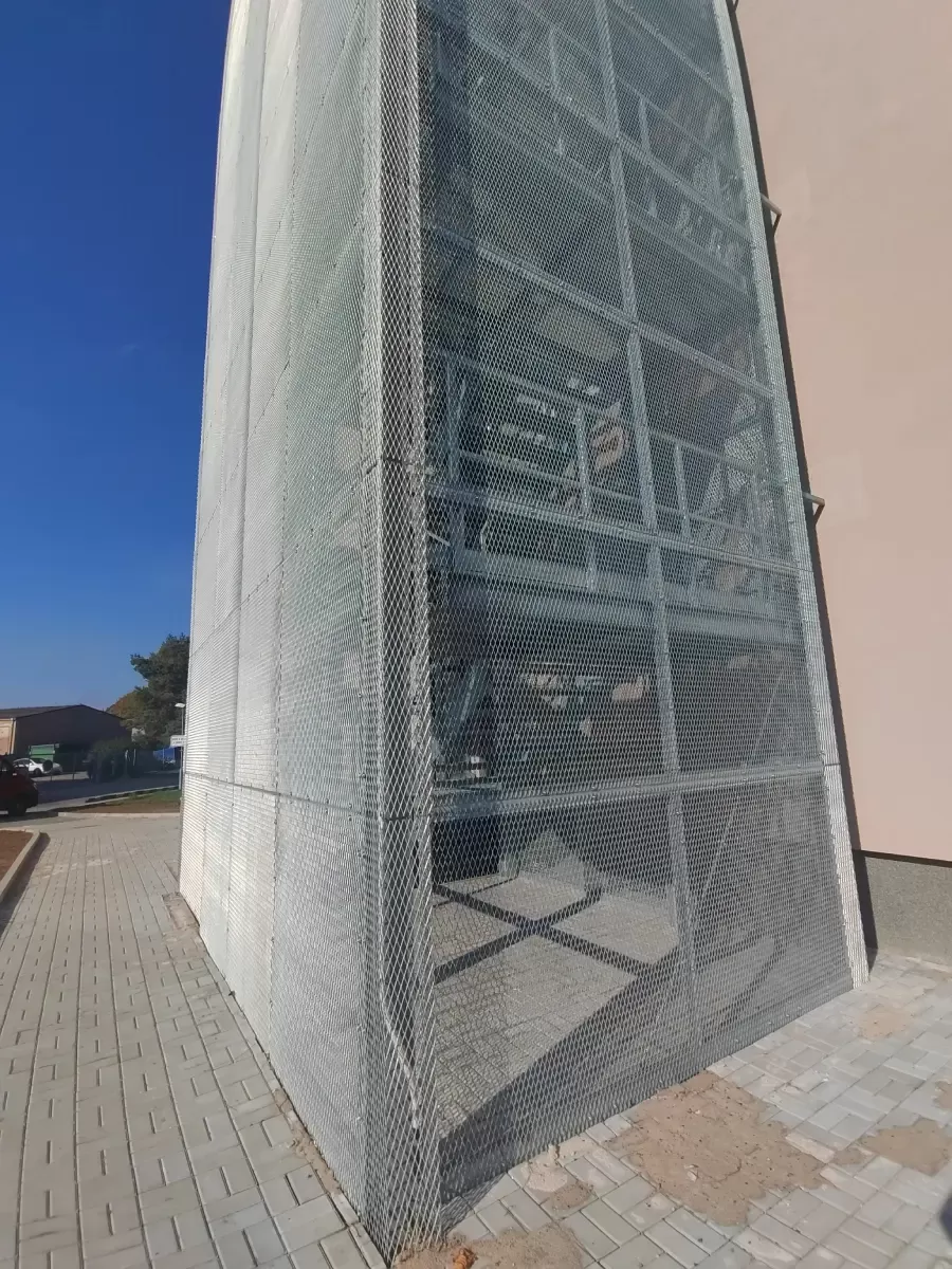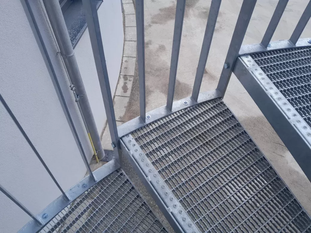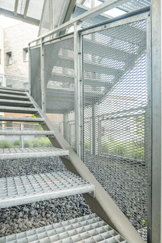 Application: Grated staircase and expanded-metal balustrade | Type: Expanded metal, diamond mesh TR 43 × 13 mm / strand width 3 mm | Material: Steel | Surface finish: Hot-dip galvanised